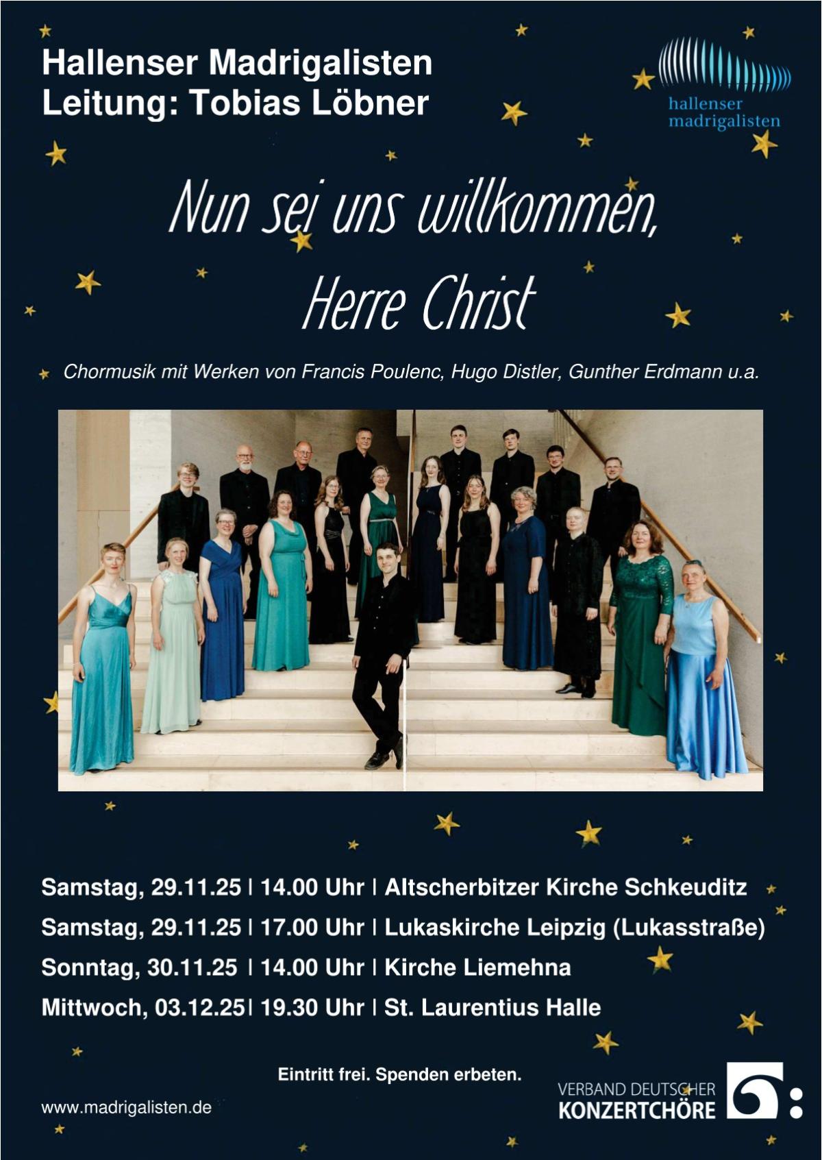 Herzliche Einladung zum Konzert der hallenser madrigalisten am Samstag, 29.11.2025 um 14:00 Uhr inder Altscherbitzer Kirche Schkeuditz. Nähere Angaben finden Sie auf dem Plakat.